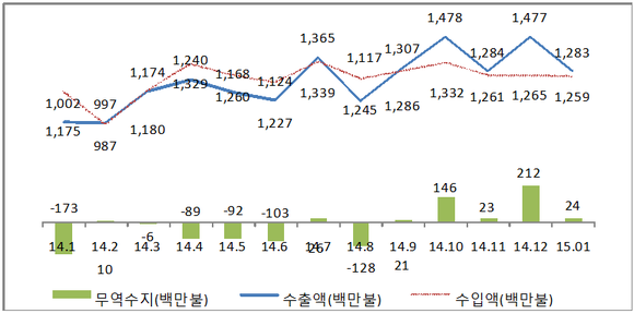 (CNB=최원석 기자) 26일 부산세관이 발표한 ‘2015년 1월 부산지역 수출입 동향’에 따르면, 전년동월 대비 수출은 28.8% 증가한 12억8300만 달러, 수입은 7% 증가한 12억5900만 달러를 기록하며 무역수지 2400만 달러 흑자를 기록했다.