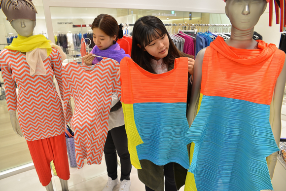 봄을 맞아 백화점 매장에도 화사한 의류가 들어선 가운데, 롯데백화점 부산본점 MB2층 ‘플리츠플리즈’ 매장에서는 봄 신상품 중 주름 소재와 지그재그 무늬가 돋보이는 여성의류를 선보여 여성고객들이 살펴보고 있다. (사진제공=롯데백화점 부산본점)