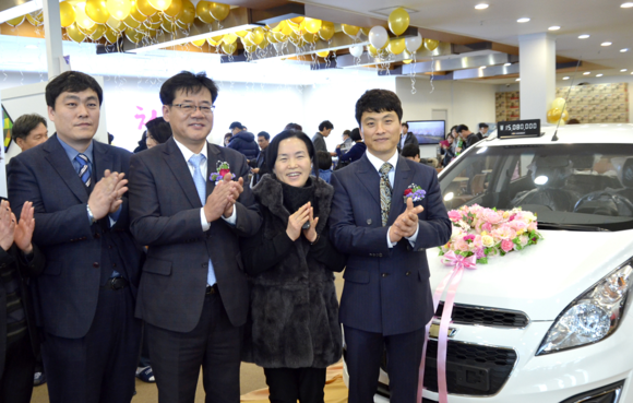▲28일 오후 3시부터 열린 경품추첨식에서 1등 경품(경차) 당첨자(오른쪽 2번째)와 세운D&C 이상근 대표(맨 오른쪽) 및 관계자들이 기념촬영을 하고 있다.