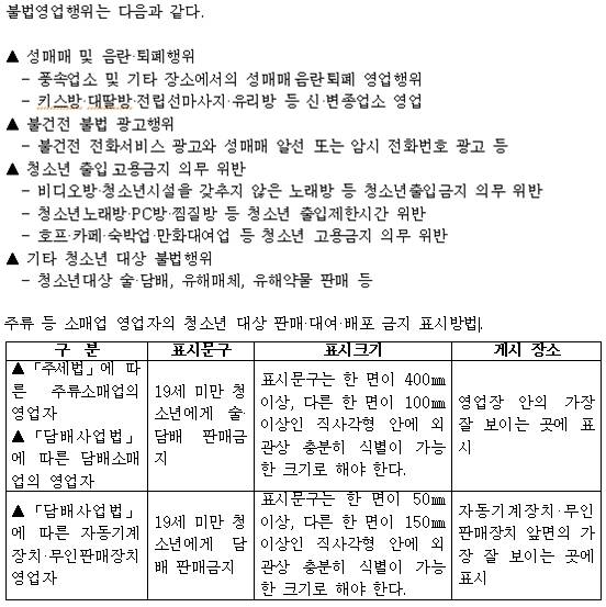 또한 오는 25일부터는 청소년보호법이 일부 개정됨에 따라 주류, 담배를 판매·대여·배포하고자 하는 자는 그 업소에 청소년을 대상으로 주류 또는 담배의 판매·대여·배포를 금지하는 내용을 표시하도록 의무화된다.