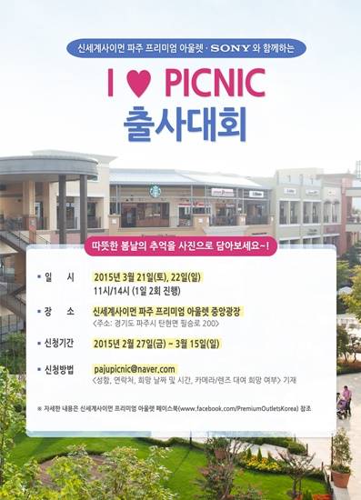 신세계사이먼(대표 강명구) 파주 프리미엄 아울렛은 소니와 함께하는 ‘아이 러브 피크닉 출사대회’를 개최하고, 오는 15일까지 참가자를 모집한다고 밝혔다.