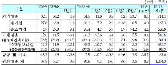 대기업대출의 경우 187조3000억원으로 1월중 4조원 늘었는데 이는 전월의 5000억원에서 대폭 확대된 것이다. 중소기업대출은 526조8000억원으로 1월중 4조4000억원이 증가, 전월의 감소(-4조2000억원)가 증가로 전환한 것이다.