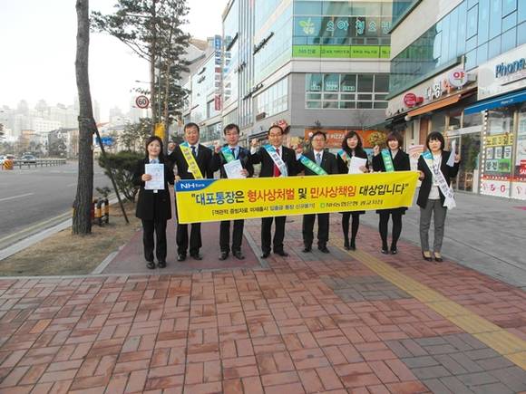 NH농협은행 광교지점(지점장 김상곤)은 지난 2일 광교중앙로 인근에서 대포통장 근절 및 보이스피싱 피해예방 캠페인을 대대적으로 전개하였다.