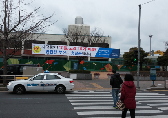 ▲부산 동구 부산진역 횡단보도에 내걸린 ‘고리1호기 폐쇄 촉구’ 현수막 모습. (사진제공=새정연 부산시당)