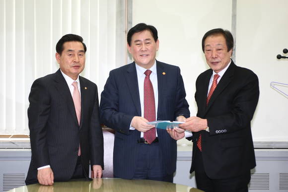 ▲고길호 신안군수, 최경환 기획재정부 장관, 이윤석 국회의원(오른쪽부터)
