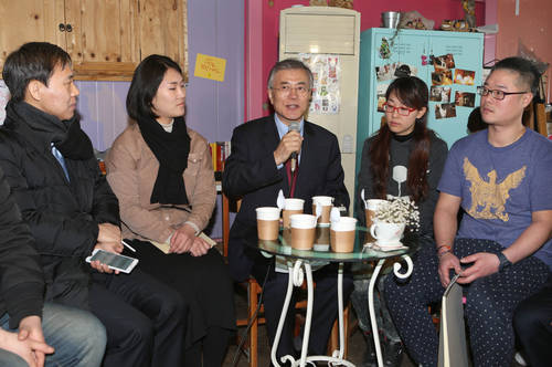 ▲문재인 새정치민주연합 대표가 4일 오전 전주 전북도청에서 열린 첫 현장 최고위원회의를 개최한뒤 전주시 남부시장 내 청년몰에서 성공한 청년 창업자들을 격려하고 있다.(전주=연합뉴스)