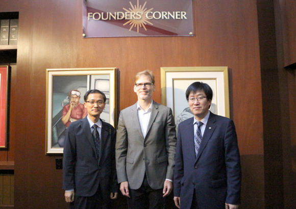 ▲오른쪽부터 최광환 부경대 의대 학장, 브루스 트롬버그 연구소장, 안예찬 동남권 의공학 임상혁신 융합연구단장. (사진제공=부경대)