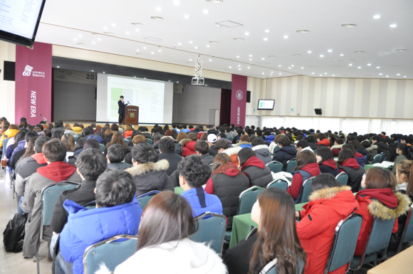 ▲4일 마린바이오산업화지원센터 대강당에서 진행된 ‘신라대 캠퍼스 몰입 프로그램’에 참가한 보건복지대학 신입생들이 대학 학사 안내에 대한 설명을 듣고 있다. (사진제공=신라대)