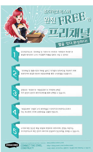 한편 프리채널에 등록된 작품은 곧 출시될 조디악코믹스 어플에 자동으로 탑재되며 4월 1일부터 만나볼 수 있다. 어플이 런칭되면 스마트폰을 통해 공모전 응모작과 여러 채널의 작품을 감상할 수 있다.