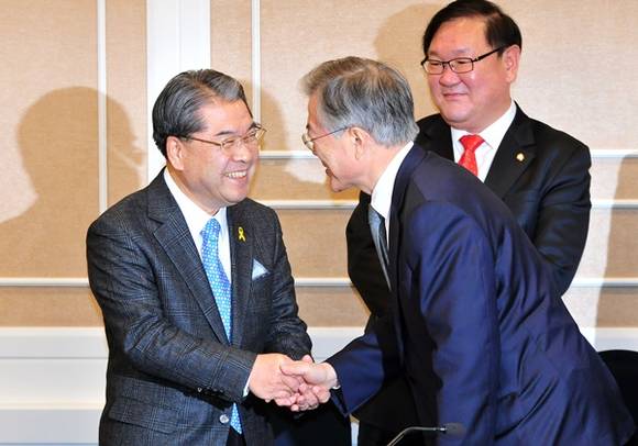 이재정 경기도교육감이 지난 6일 국회에서 열린 문재인 새정치민주연합대표 초청 전국시도교육감협의회 간담회에 참석해 문재인 대표와 인사를 나누고 있다.