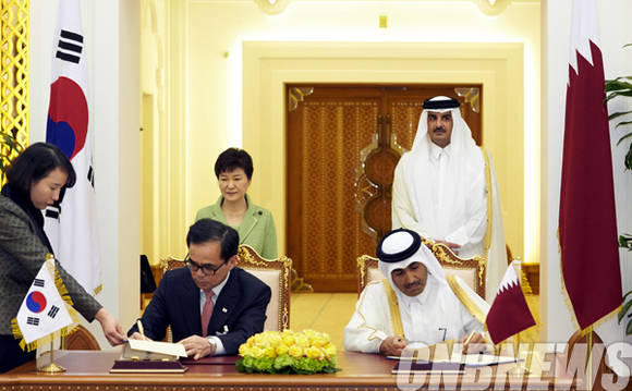 박근혜 대통령과 타밈 빈 하마드 알타니 카타르 국왕이 참석한 가운데 8일 12시 30분(현지시각), 카타르의 수도 도하(Doha) 에미리 디완 궁에서에서 김종 문화체육관광부 제2차관(사진 좌측)과 이사 빈 모하메드 알 모한나디 카타르 관광청장이 인적교류 확대 등을 내용으로 하는 관광협력 양해각서(MOU)를 체결하고 있다.(사진=문화체육관광부)