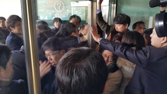 ▲면담이 원천봉쇄되자 '급식네트워크'는 정문 출입을 시도하며 심한 몸싸움을 벌이기도 했으나 공무원들의 강한 저지로 무산됐다. 분노에 찬 학부모 등 시민들은 공무원들을 향해 '불통의 문을 열라'며 강하게 대응하기도 했다.