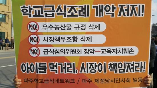 학부모들이 포함된 17개 정당·시민사회단체로 긴급 구성된 파주학교급식네트워크(이하 ‘급식네트워크’)는 파주시의 학교급식조례 개정안을 개악으로 정의하고 이재홍 파주시장의 면담을 요구하자 파주시는 모든 출입구를 봉쇄하고 30여명의 공무원을 배치하는 등 강력하게 대응했다.