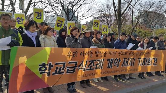 파주시는 2007년 학교급식지원 조례 제정 이후 그에 부합하는 사전심의절차와 행정감사 개선조치를 차례도 이행하지 않아 논란이 되고 있다. 이에 대해 파주시의회를 비롯한 학부모, 농민 등 관련단체들의 문제제기가 거세지자, 파주시는 2015년 초까지 학교급식지원심의위원회를 조속히 개최하기로 해놓고, 지난달 16일 느닷없이 관련 조례에 대한 문제의 개정안을 입법 예고한 바 있다.