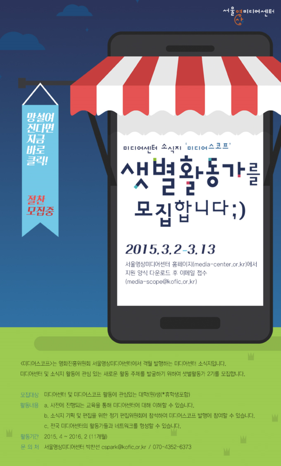 지원방법은 서울영상미디어센터 홈페이지(media-center.or.kr)내 양식을 다운받아 이메일(media-scope@kofic.or.kr)로 지원하면 되며, 최종 합격자는 3월 말 발표된다.