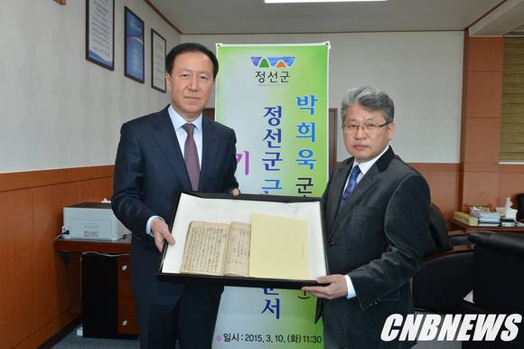 (CNB=최성락 기자) 정선군은 10일 군청 소회의실에서 지난 1908년 ~ 1911년까지 정선군수를 역임한 박희욱 전 정선군수의 행정 기록서 '기증식'을 가졌다고 밝혔다. 기증자는 박희욱 전 정선군수의 직계손자 박연성 氏이며 이번 기증문서는 당시 군수 재임 시 처리한 행정 문서를 필사한 것으로 시대 상황과 정선의 현황이 담긴 자료이며 군은 당시의 시대상을 이해하는 역사 자료로 활용할 계획이다.