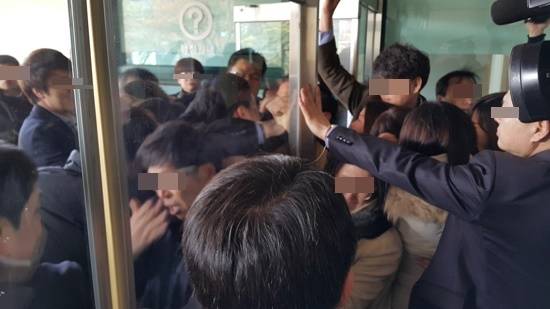 ▲파주시의 학교급식조례 개정안에 반대하는 학부모 및 시민단체가 지난 9일 시장과의 면담이 성사되지 않자 중앙현관에서 공무원 30여명과 몸싸움을 벌이기도 했다.