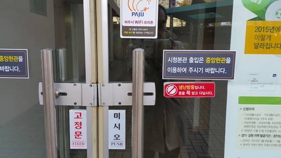 그러나 아직 시청사는 중앙현관을 제외한 모든 문이 외부에서 차단돼 민원인이나 시민들이 시청으로 들어서려면 중앙현관을 통해 입장해야 한다. 정문 현관 1층에는 공무원들이 배치돼 2층으로 올라가는 시민들이나 민원인들을 통제하고 있다.