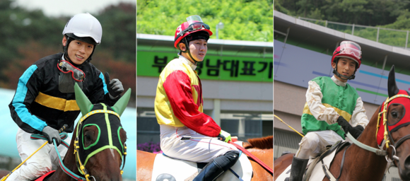 ▲올 첫 시즌 100승 달성에 가장 유력한 후보인 (왼쪽부터) 조성곤, 유현명, 김용근 기수. (사진제공=렛츠런파크 부경)