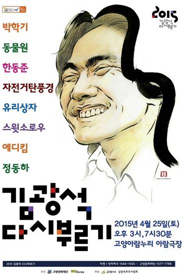 고양문화재단(대표 안태경)은 오는 4월 25일(토) 고양아람누리 아람극장에서 '2015 김광석 다시부르기' 콘서트를 오후 3시, 7시 30분 2회 걸쳐 공연한다고 밝혔다. '김광석 다시부르기' 콘서트는 2009년부터 시작돼 한 가수를 추모하는 단일 공연으로서는 세계에서 유례없는 최장기, 최대 규모로 대중음악 콘서트다.