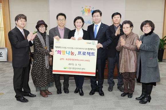 이날 ㈜이마트는 수원시휴먼서비스센터와 ㈜이마트가 함께 추진하는 2015 희망나눔 프로젝트를 위해 후원금 6000만 원을 수원시휴먼서비스센터에 전달했다.