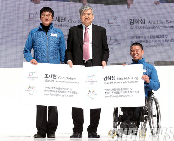이날 조양호 평창동계올림픽조직위원회위원장(사진 중앙)이 홍보대사 위촉식을 마친 뒤에 조세현 사진작가, 김학성 휠체어컬링 선수와 기념 촬영을 하고 있다.(사진=문화체육관광부)