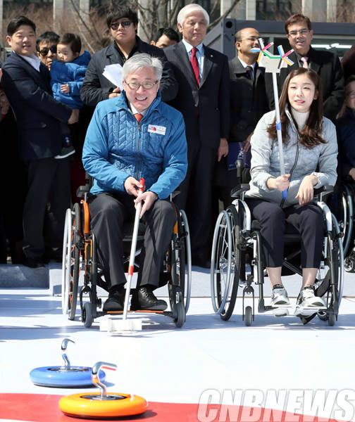 이날 김종덕 문체부 장관이 김연아 평창올림픽 홍보대사와 패럴림픽 경기 종목인 ‘휠체어컬링’을 직접 체험해 보고 있다.(사진=문화체육관광부)