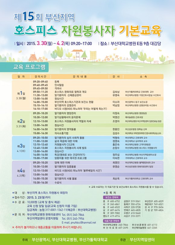 교육대상은 부산지역 호스피스 자원봉사 희망자(약 150여명)로, 총 교육시간의 80% 이상을 출석해 교육과정 수료 시 각 의료기관 및 보건소에서 호스피스 자원봉사자로 활동할 수 있는 자격을 획득할 수 있다.