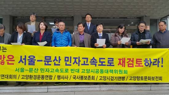 서울-문산 민자고속도로 반대 고양시 공동대책위원회는 18일 고양시청 본관 앞에서 '서울-문산 민자고속도로 반대' 기자회견을 열고 "국민의 혈세를 낭비하는 민자고속도로는 고양시 지역을 양분하고 녹지축을 훼손하는 것"이라며 강력한 반대의사를 표명했다. 서울문산간 민자고속도로는 서울 방화대교 북단에서 파주시 문산읍까지 35.6km, 민자고속도로다.
