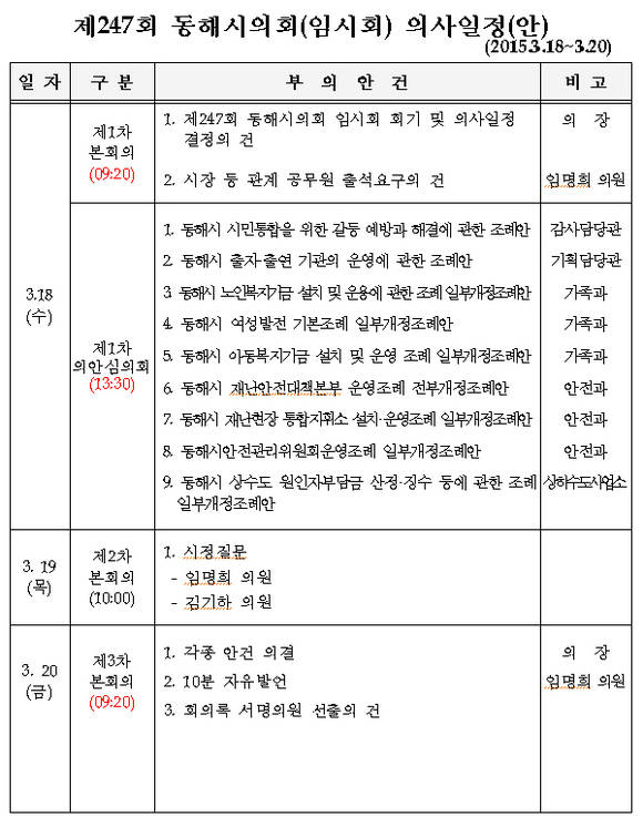 한편 동해시의회 관계자는 "의정활동을 보다 신속하고 투명하게 알리기 위해 인터넷방송 시스템을 운영하고 있다. "며 "모든 본회의는 시의회 홈페이지(http://www.dhcc.go.kr)를 통해 생방송 또는 녹화방송으로도 시청 가능하다. "고 전했다.