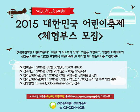 (CNB=최성락 기자) 육영재단 어린이회관(이사장 조수연)은 오는 23~25일까지 '2015 대한민국 어린이축제' 체험부스에 참여할 청소년 동아리를 모집한다고 18일 밝혔다.