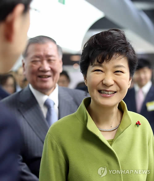 ▲박근혜 대통령과 정몽구 현대차 회장(왼쪽)이 지난 1월 27일 광주창조경제혁신센터 개소식을 마친 뒤 센터를 둘러보며 환하게 웃고 있다. (사진=연합뉴스)