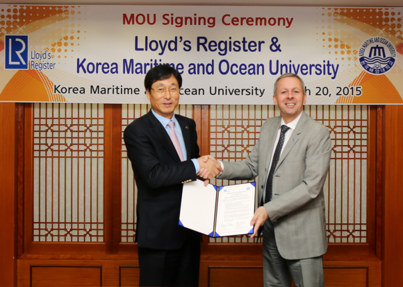 ▲왼쪽부터 박한일 한국해양대 총장, 리차드 세들러 영국 로이드선급 회장. (사진제공=한국해양대)