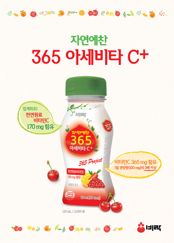 비락 강종구 영업부문장은 “흔히 녹즙은 특유의 맛과 향 때문에 마시기 힘들다는 분들이 많지만 ‘365아세비타C플러스’는 상큼한 아세로라의 풍미를 그대로 느낄 수 있어 거부감 없이 맛있게 즐길 수 있는 녹즙이며, 환절기 피부나 건강관리에 관심 있는 여성들을 위해 새롭게 출시하게 됐다”고 말했다.