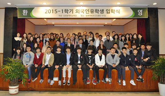 신라대학교(총장 박태학)는 20일 오전 교내 동북아비즈니스지원센터 101호 회의장에서 노영욱 교무처장과 강경태 신라한국어교육원장을 비롯한 주요 보직자들과 미국, 중국, 일본, 러시아, 가나, 베트남 등 8개국 출신 외국인 유학생 203명이 참석한 가운데 2015학년도 1학기 외국인 유학생 입학식을 가졌다. (사진제공=신라대)
