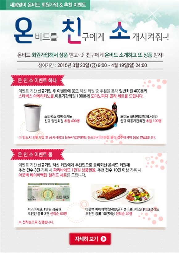 캠코는 3월 20일부터 4월 19일까지 진행되는 ‘온·친·소’이벤트를 통해 온비드 신규 가입회원 500명에게 추첨을 통해 스타벅스 아메리카노(일반회원 400명)와 도미노 피자·콜라 세트(이용기관회원 100명)를, 해당기간 신규 가입회원에 의해 추천인으로 등록된 온비드 회원에게 파리바게뜨 1만원 상품권(추천 3건 이상, 60명)과 아웃백 베이비백립·샐러드 세트 상품권(추천 10건 이상, 20명)을 제공할 계획이다.