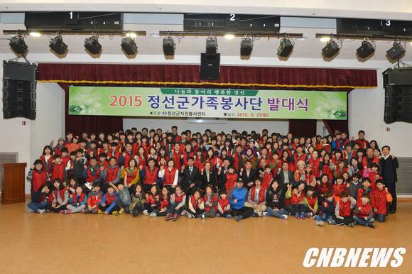 정선군가족봉사단은 15개팀, 103가족 385명으로 구성됐으며 이달부터 오는 10월까지 월 1회 이상 연간 30시간 이상 시설방문, 환경정화, 지역행사 지원활동, 사랑의 연탄나누기, 농촌일손돕기 등 다양한 활동을 수립해 전체 활동과 팀별 활동으로 전개한다.