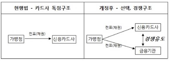 카드사가 지금까지 2%대의 수수료를 받고 있었다면 은행 등에서 참여할 경우 경쟁논리에 따라 1%대로 전표를 사갈 수도 있게 된다는 부연이다. 법 개정이 이뤄질 경우 가맹점 수수료율 1%포인트 인하시, 중소신용카드 가맹점(연매출액 2억원 이상, 66만 곳)에게 연 2조원 이상의 혜택(2013년 매출기준)이 돌아갈 수 있을 것으로 기대하고 있다.
