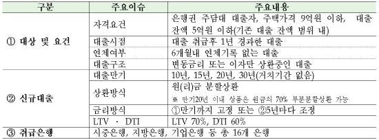 전환대상을 살펴보면 주택가격 9억원 이하, 대출금액 5억원 이하로 대출 취급 후 1년이 경과하고 6개월 내 연체기록이 없는 대출이 해당된다.