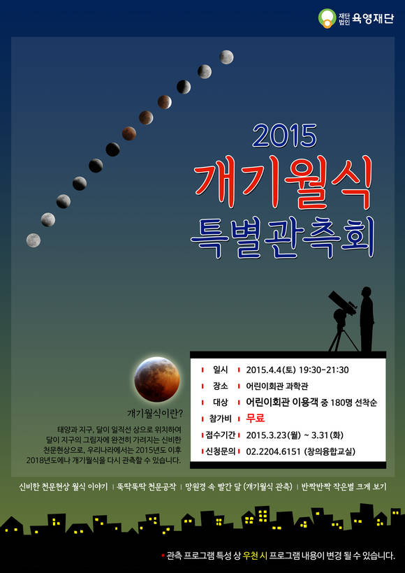 (CNB=최성락 기자) (재)육영재단 어린이회관(이사장 조수연) 창의융합교실은 내달 4일 개기월식을 함께 보면서 우주의 신비를 경험해 보고자 하는 취지로 '2015년 개기월식 특별 관측회'를 개최한다고 23일 밝혔다.