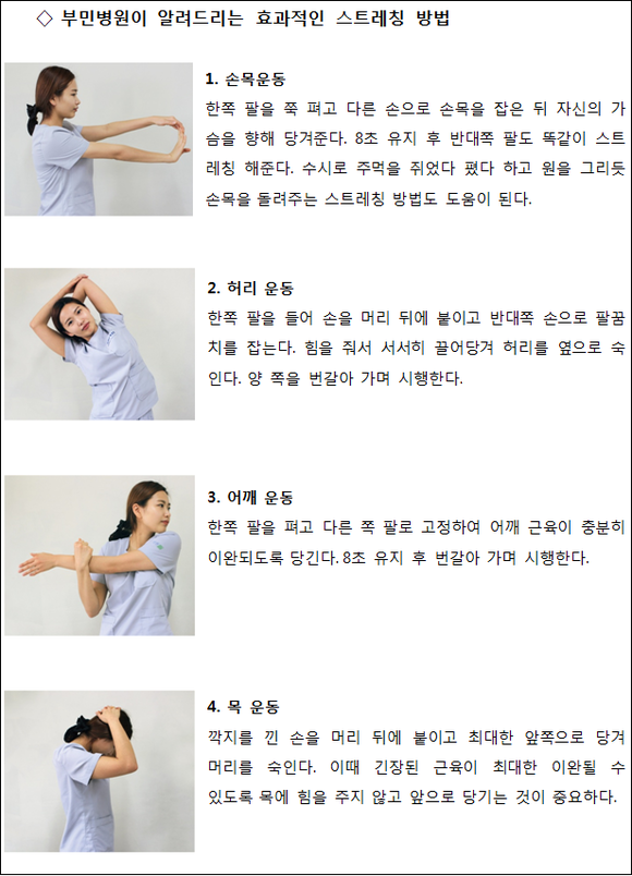이홍석 과장은 “본격적인 운동에 앞서 목, 어깨, 허리 등의 관절을 풀어주면 우리 몸의 유연성을 회복하는 데 도움이 되며 근육에 가해지는 갑작스러운 충격을 방지할 수 있어 스포츠 손상은 물론, 급성 디스크 등을 예방 할 수 있다”며 “자신의 체력에 맞는 운동을 일주일에 세 번 이상, 바른 자세로 하는 것이 건강에 도움이 된다”고 밝혔다.
