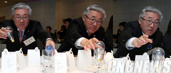 이날 김종덕 문화체육관광부 장관이 오프닝 행사로 컵에 물을 붓고 전구를 넣어서 전구에 불이 켜지게 하는 퍼포먼스를 하고 있다. 이 작품은 김민호 작가의 ‘comlight’ 이다.(사진=문화체육관광부)