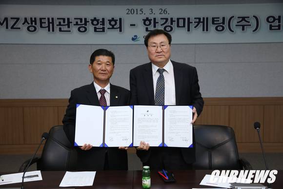 ▲▲ 김창해 양구DMZ생태관광협회 회장(왼쪽)과 이상해 한강마케팅(주) 대표(오른쪽)가 협약서를 들고 기념촬영을 하고 있다. (사진제공=양구군청)