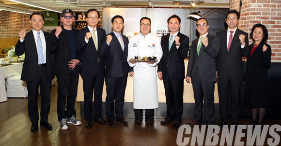 왼쪽부터 차은택 감독, 김철하 CJ제일제당 대표이사, 김영근 이도 사장, 김병필 CJ푸드빌 연구소장, 박민권 문화체육관광부 1차관, 변추석 한국관광공사 사장, 정문목 CJ푸드빌 대표이사, 정혜경 호서대 교수(사진=문화체육관광부)