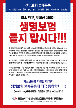 ▲금소연은 자살보험금 지급을 거부하는 생보사를 대상으로 보험상품 불매운동도 진행하고 있다.(사진제공=금소연)