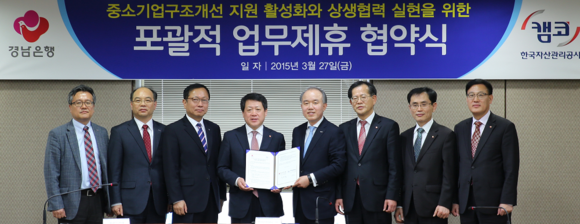 (CNB=최원석 기자) 한국자산관리공사(캠코, 사장 홍영만)는 경남은행(은행장 손교덕)과 27일 오전 11시 경남은행 본점에서 ‘중소기업 구조개선 지원 활성화와 상생협력 실현을 위한 포괄적 업무제휴 협약’을 체결했다고 밝혔다.