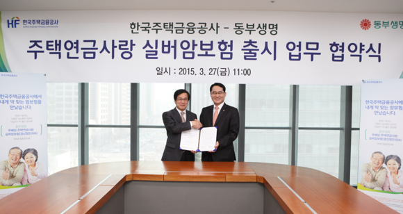 주택금융공사(HF, 사장 김재천)는 동부생명보험(주)과 27일 협약식을 갖고, 주택연금에 가입하면 최대 16.5% 할인된 보험료로 이용할 수 있는 ‘주택연금사랑 실버암보험’을 오는 30일 출시하기로 했다고 밝혔다.