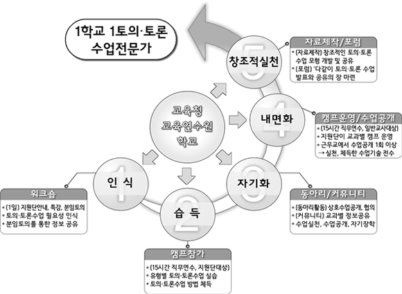 구체적인 내용으로는 교사전문성 신장을 위한 1학교 1토의·토론수업전문가 양성, 학교토론문화 조성을 위한 단위학교의 토의·토론수업 실시, 실천적 인성교육중심의 수업 분위기 조성 등을 통해 단위학교의 역량을 강화하고자 한다.