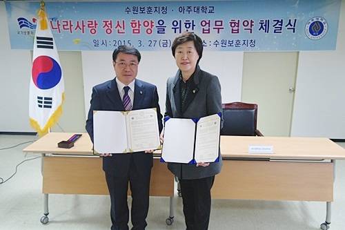 수원보훈지청(지청장 이재익)은 지난 27일 청사 회의실에서 아주대학교 간호학과(학장 유문숙)와 나라사랑 정신 함양 및 보훈가족 사랑 나눔을 위한 업무협약을 체결했다.