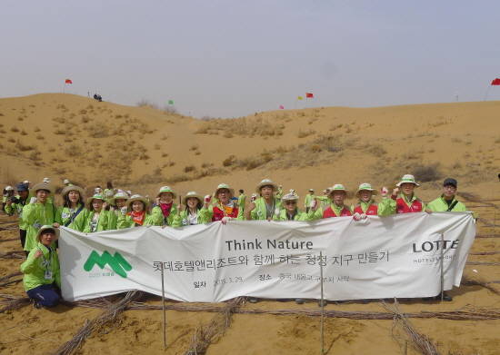 한국환경산업기술원, 미래숲 그린코어(구 녹색봉사단), 각계 각층의 청년 멘토 등약 120명이 참가한 이번 식수 활동에서 롯데호텔은 중국 내몽고자치구 쿠부치 사막 3만㎡에 식수 1만6000본을 심어 사막화 방지와 방풍림 조성 활동을 전개했다.